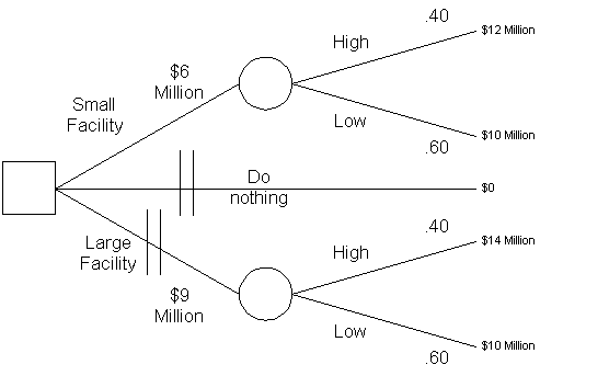 Expected payoff of large facility = 2.6 million ((.4*14+.6*10) - 9 = 2.6 mil.